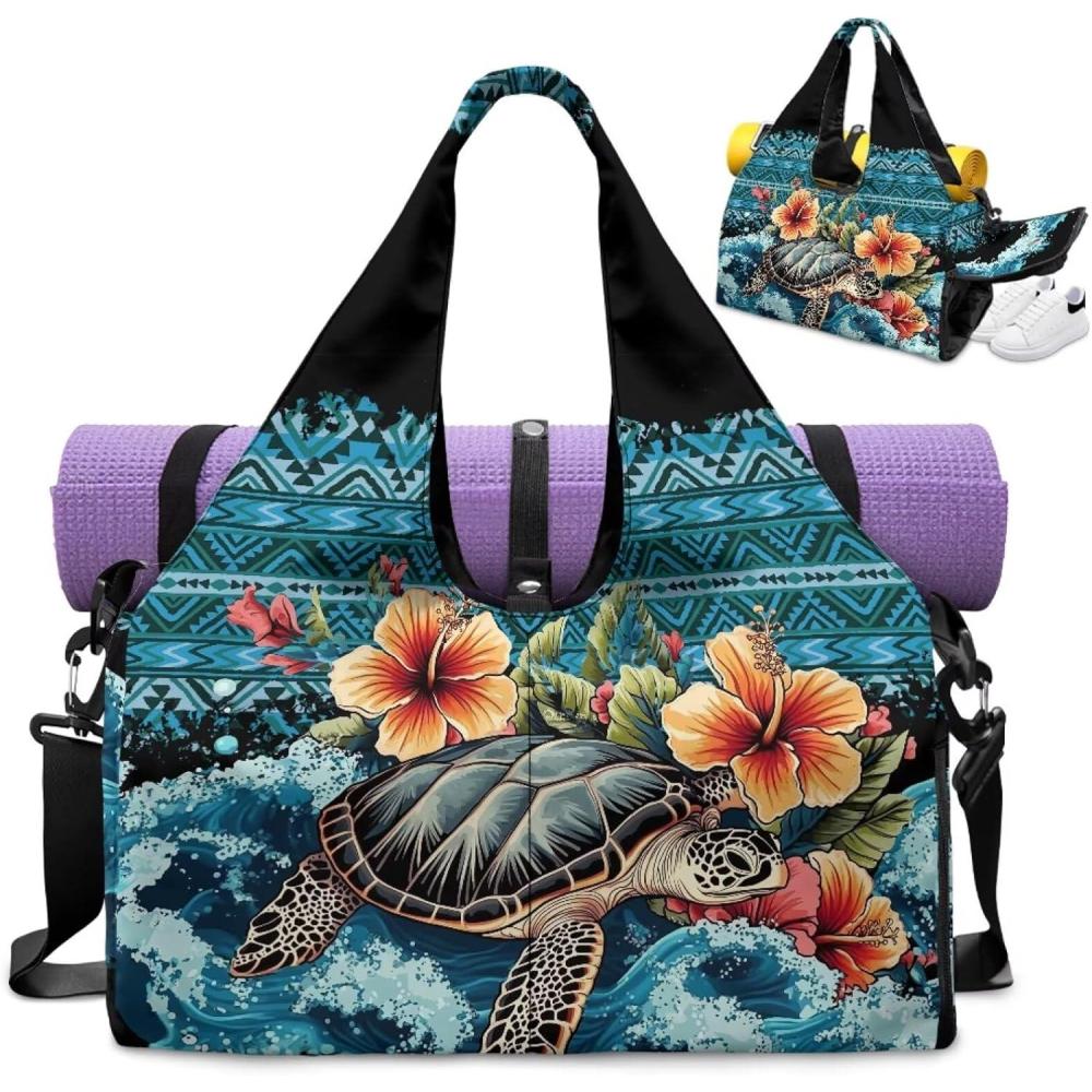 Gym Bag with Yoga Mat Holder Large Tote Bag With Multi Pockets for Women Men Dry Wet Separated Pocket Carryall Yoga Tote Bags for Pilates Travel Workout Office(Sea Turtle& flower)